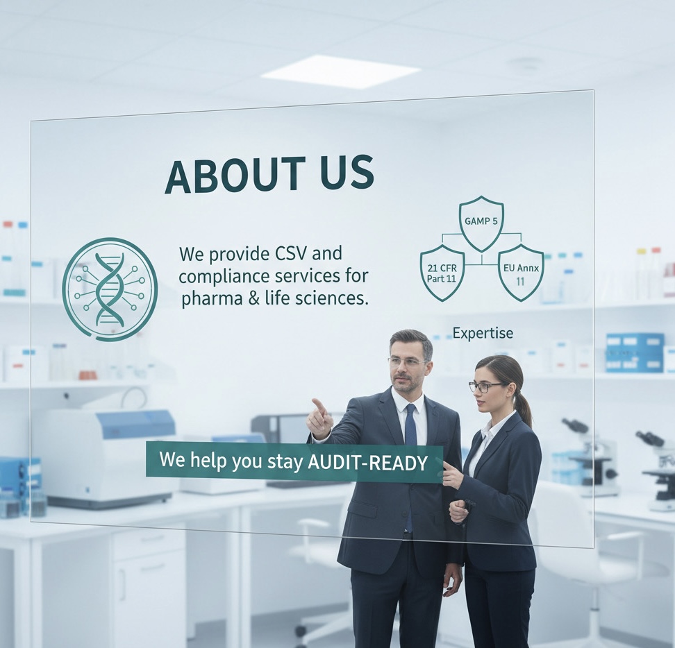 We provide Computer System Validation (CSV) and compliance services for pharma & life sciences. With GAMP 5, 21 CFR Part 11, EU Annex 11 expertise, we help you stay audit-ready.